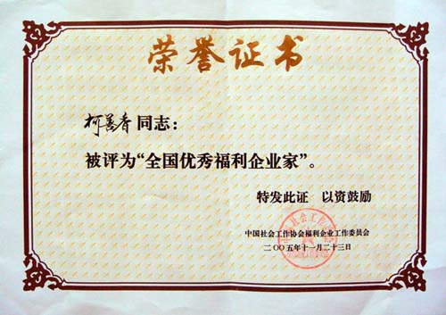 National Excellent Welfare Entrepreneur Honor Certificate